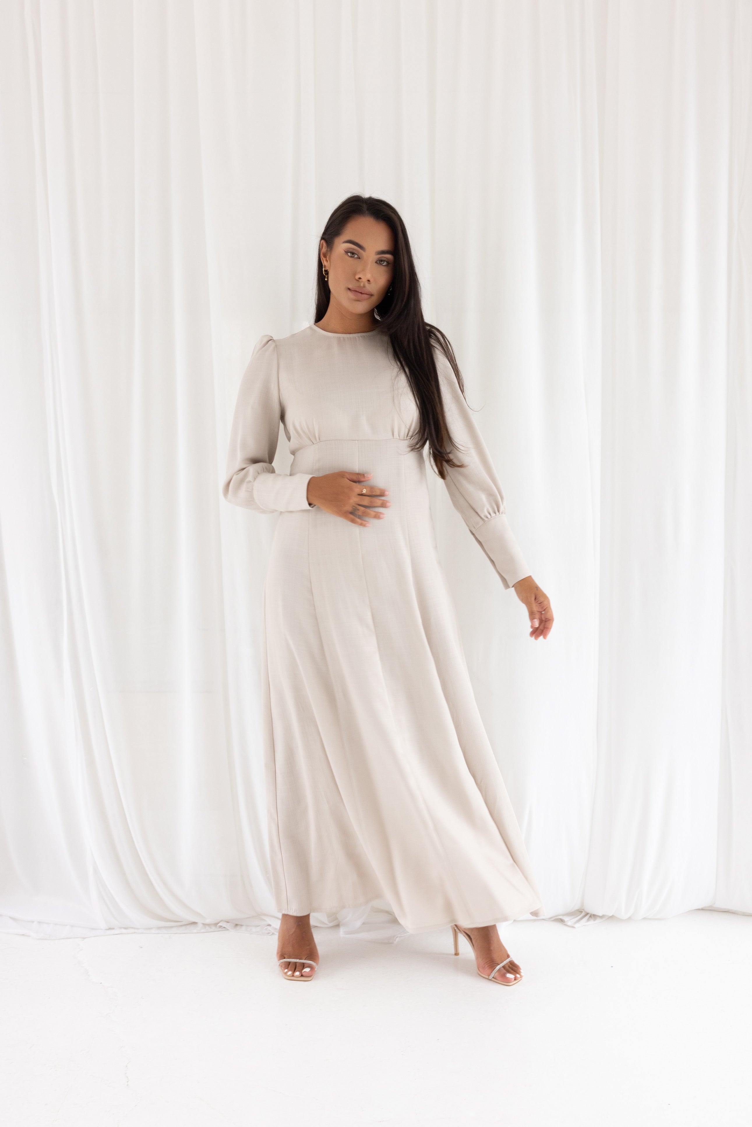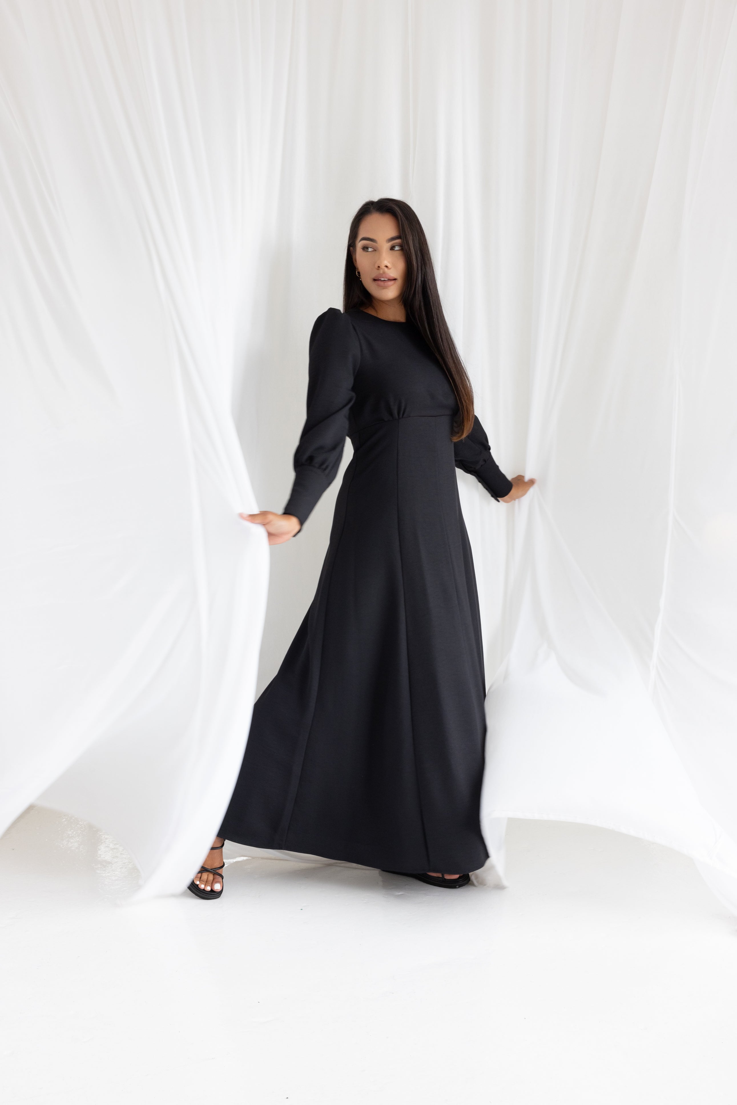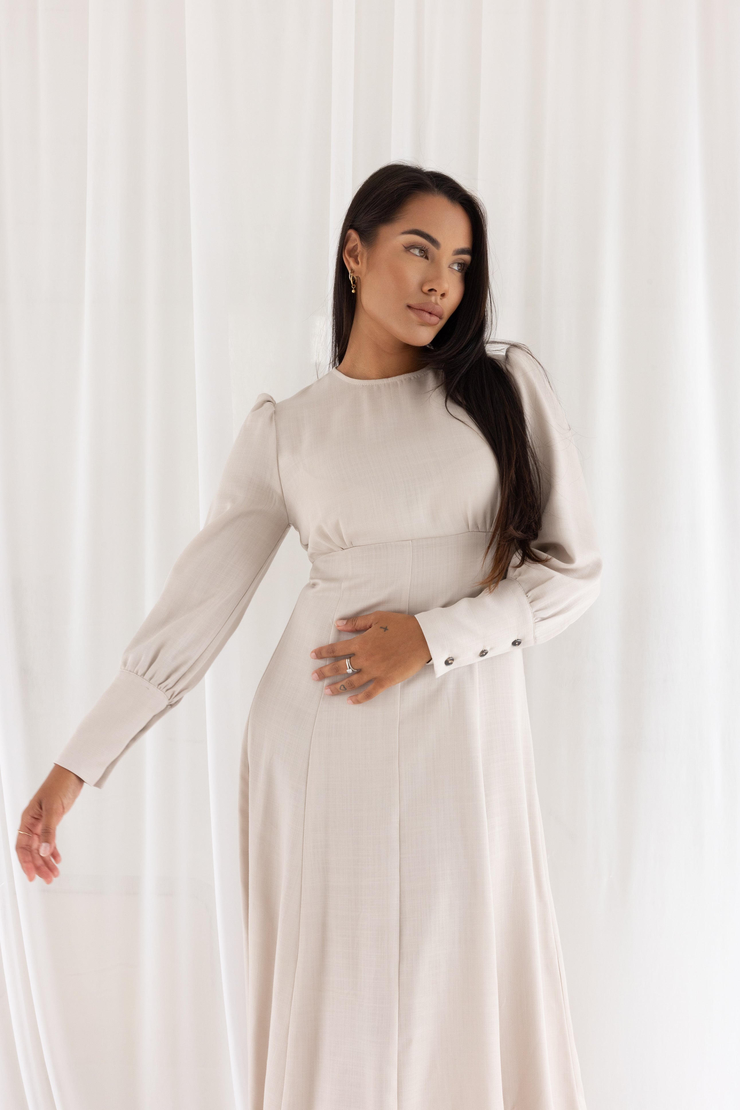 The ALAIA is a flattering dress designed to make you appear taller. This piece is a fully lined, panelled dress. The dress features gathers under the bust seam, as well gathers around the sleeve head. The dress also features elongated cuffs, sitting right at the wrist.
