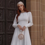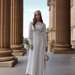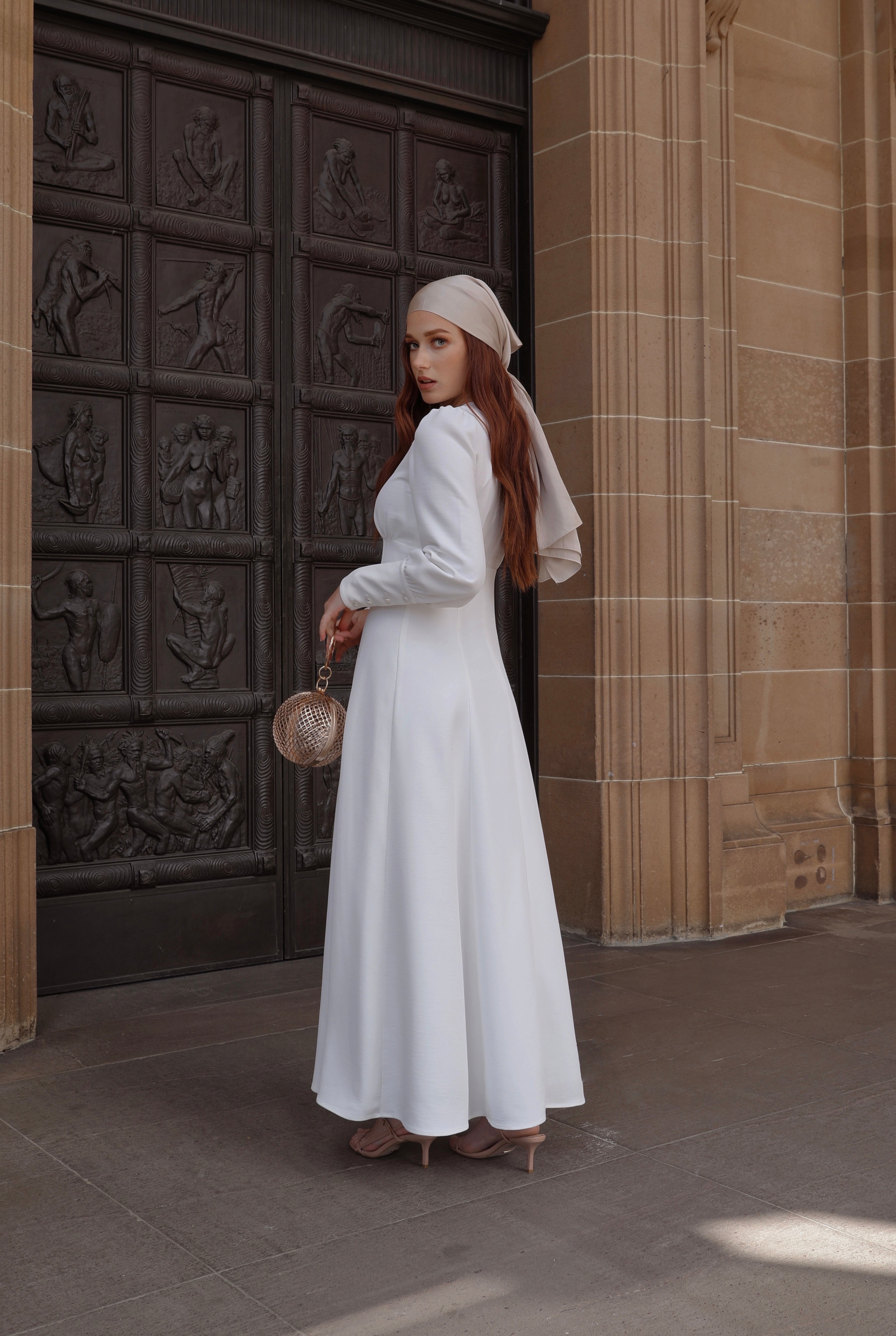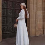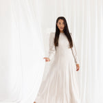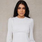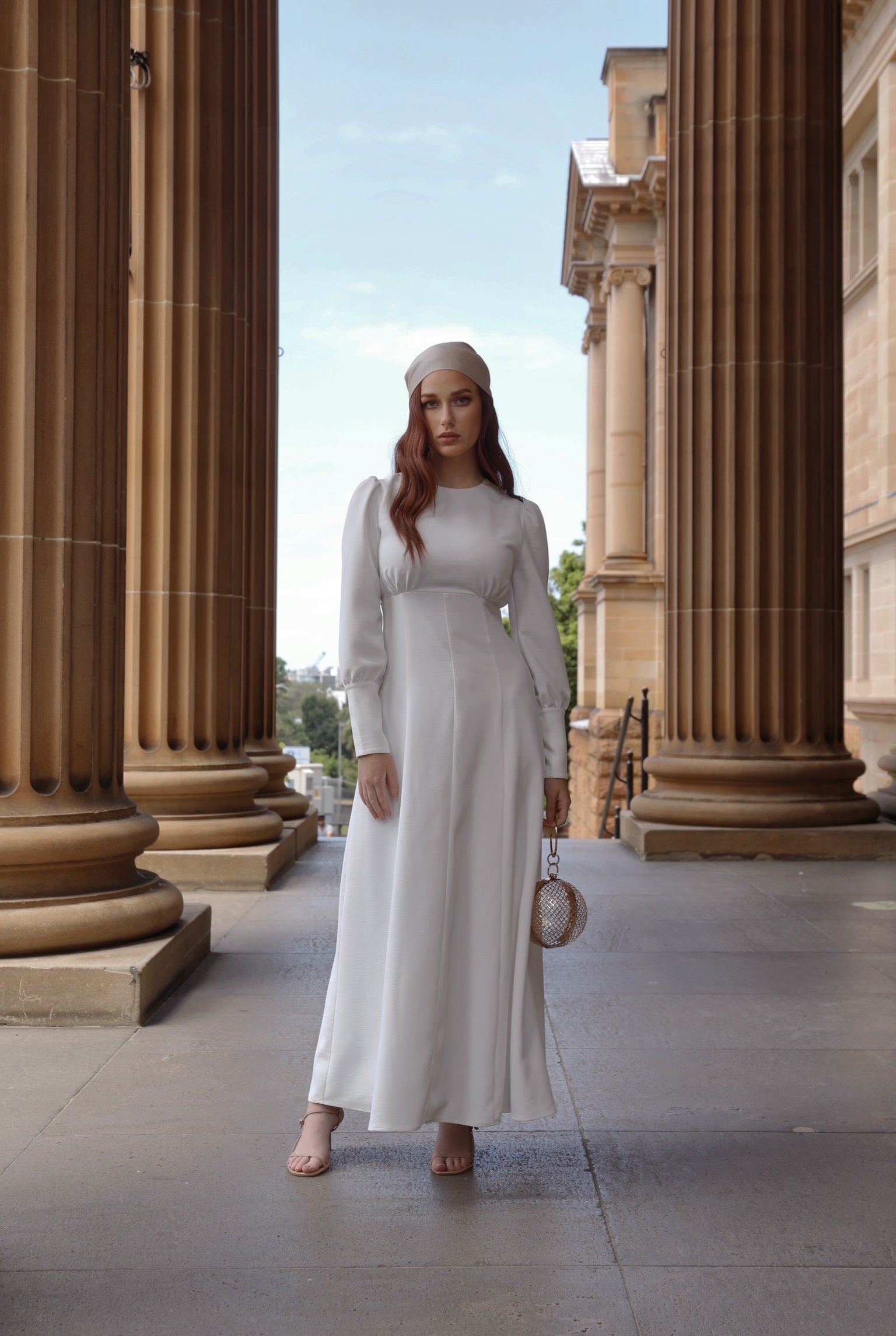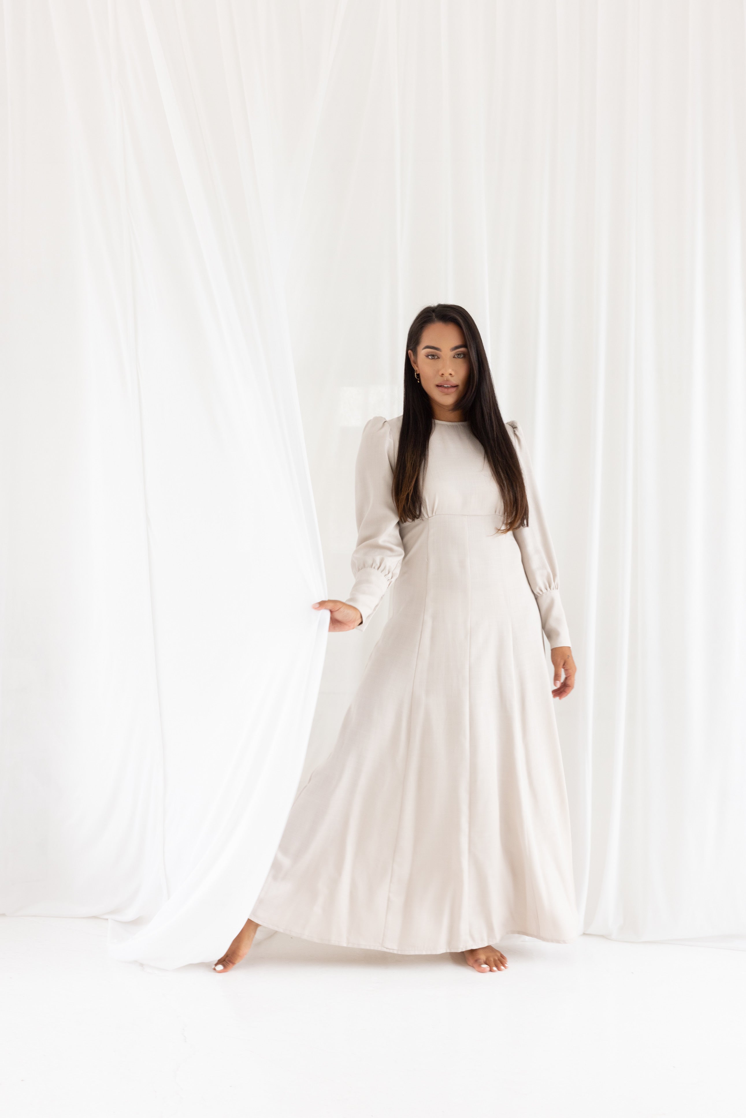 The ALAIA is a flattering dress designed to make you appear taller. This piece is a fully lined, panelled dress. The dress features gathers under the bust seam, as well gathers around the sleeve head. The dress also features elongated cuffs, sitting right at the wrist.