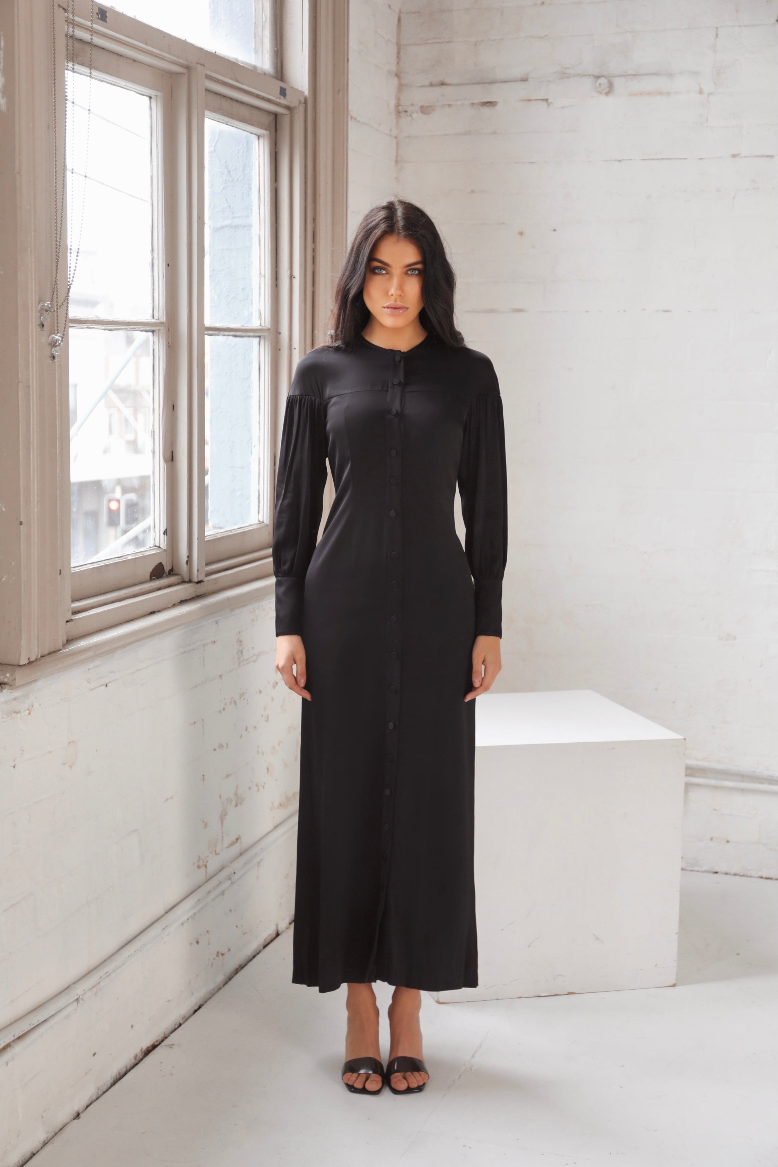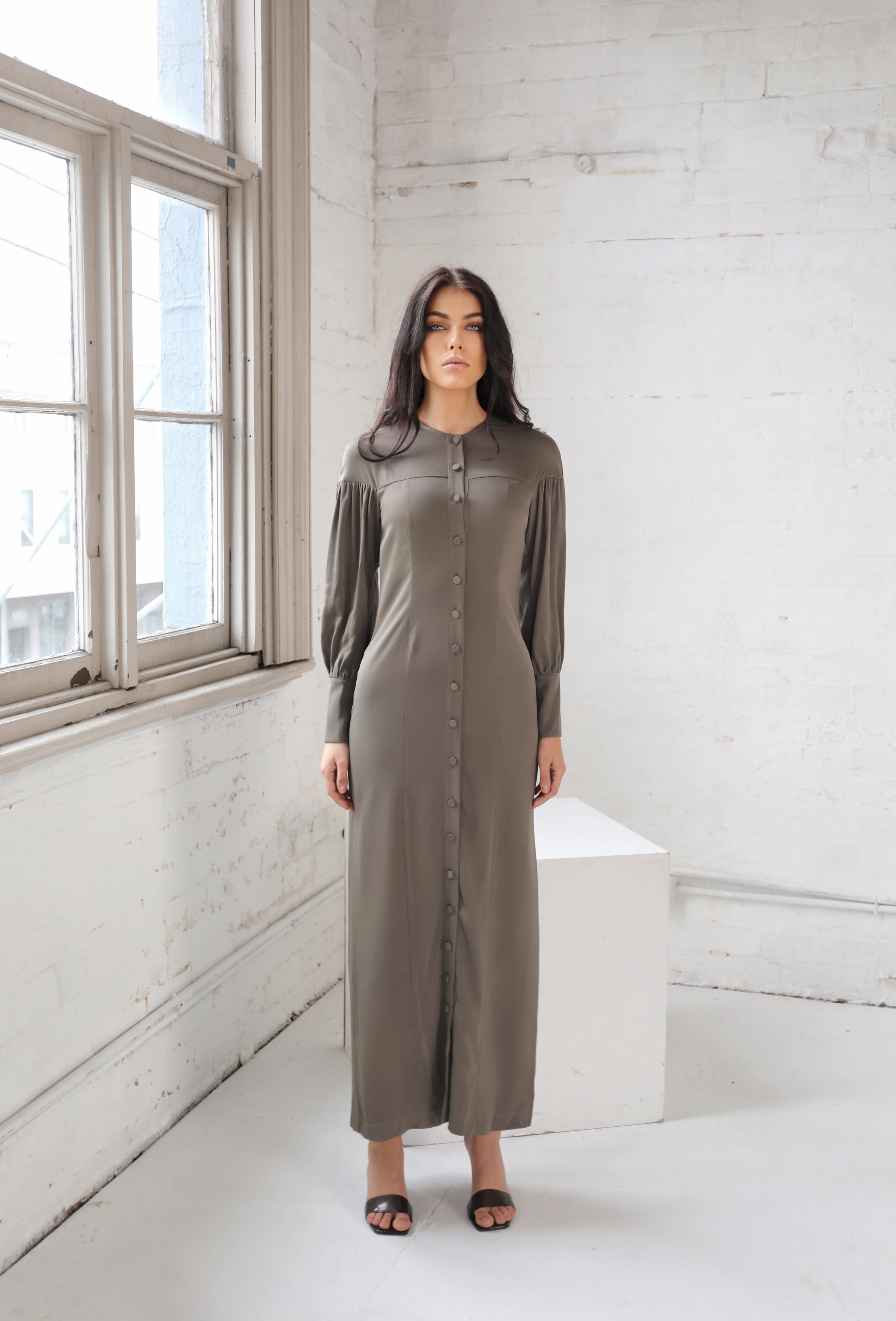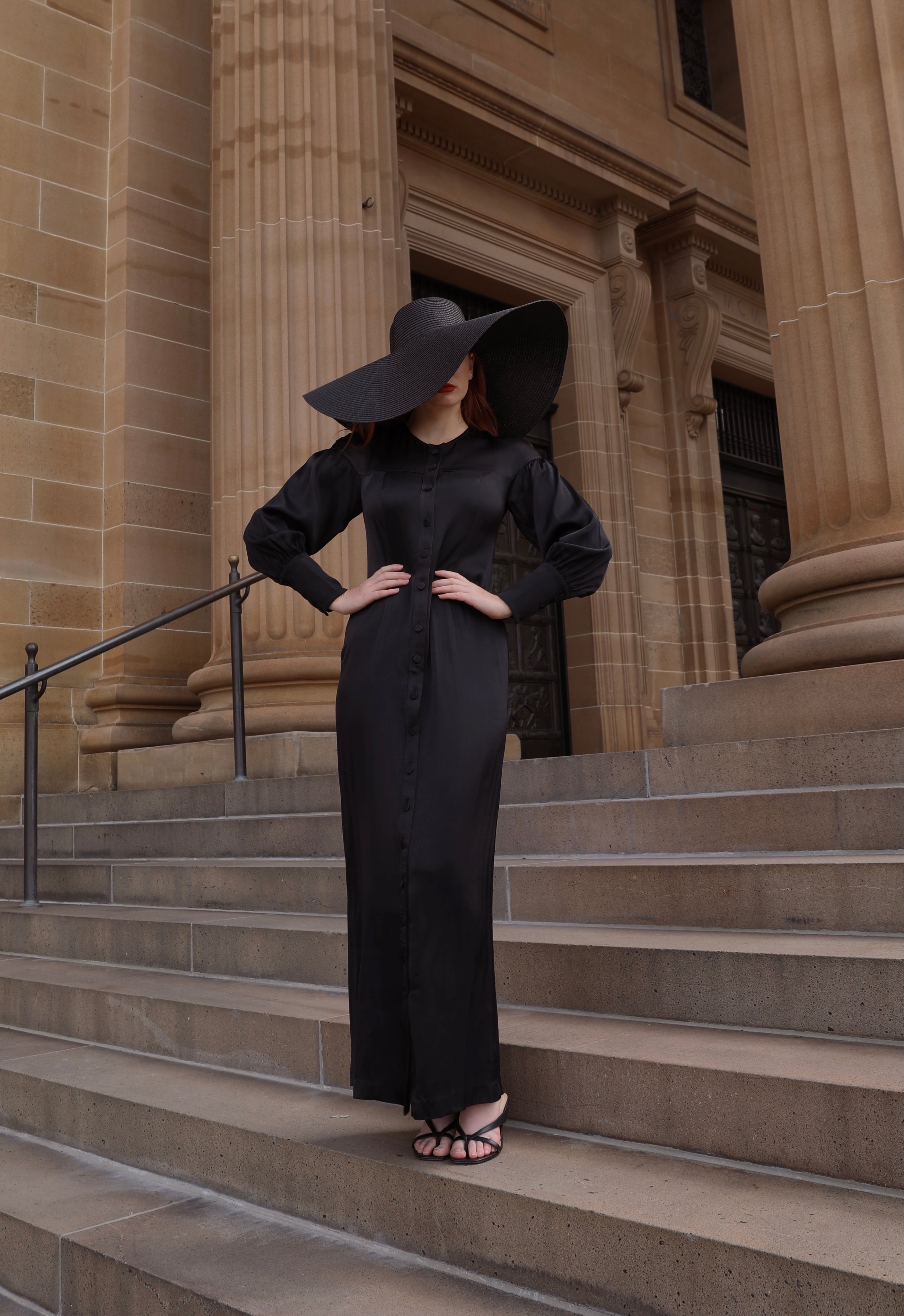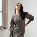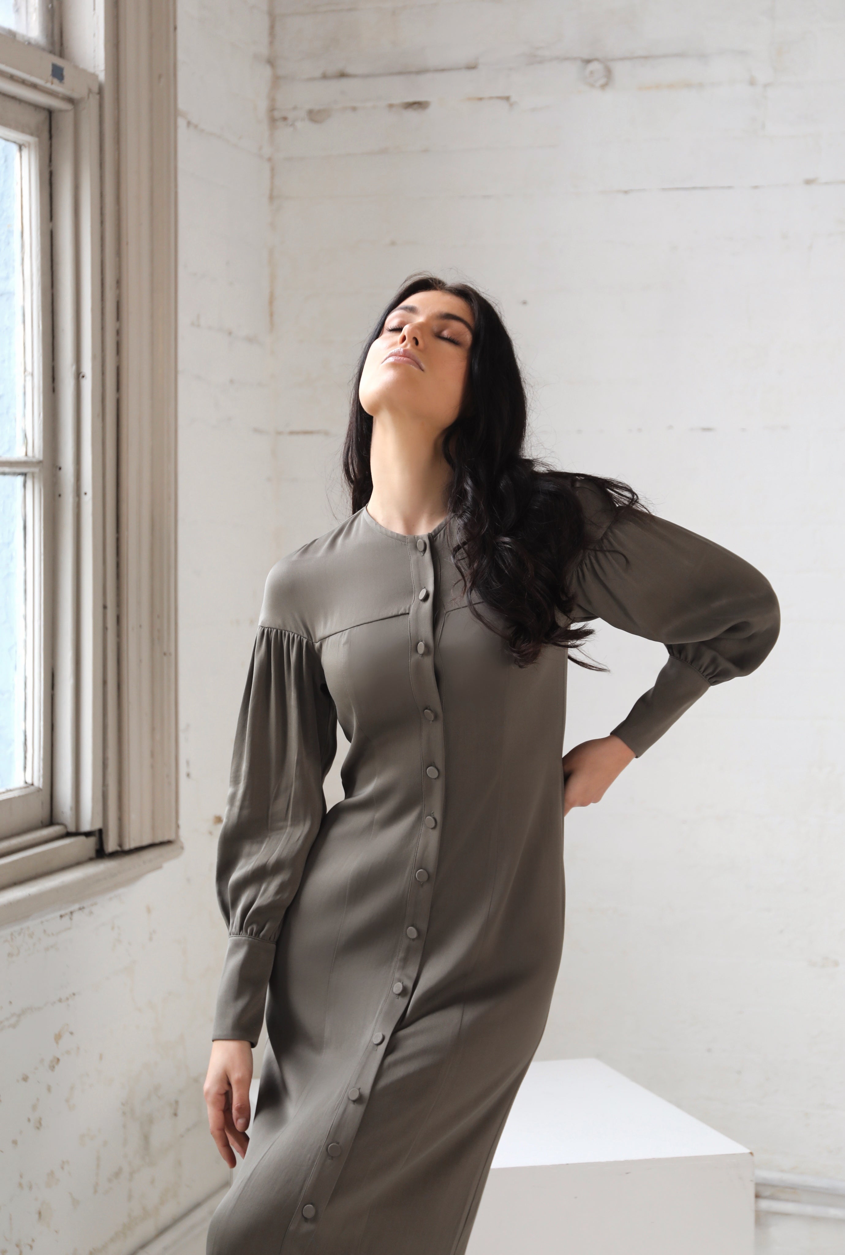 The AMAL dress is one designed to be completely versatile. It can be worn both opened and closed. The dress features 17 buttons on the placket, and 3 buttons on each cuff, each hand sewn. The dress is also panelled for a slimming fit, and also features a kick pleat, making it easier to walk. It's light-weight bamboo silk fabric is breathable and perfect for the warm seasons. The dress has a 6mm double turned hem, and is ankle length.