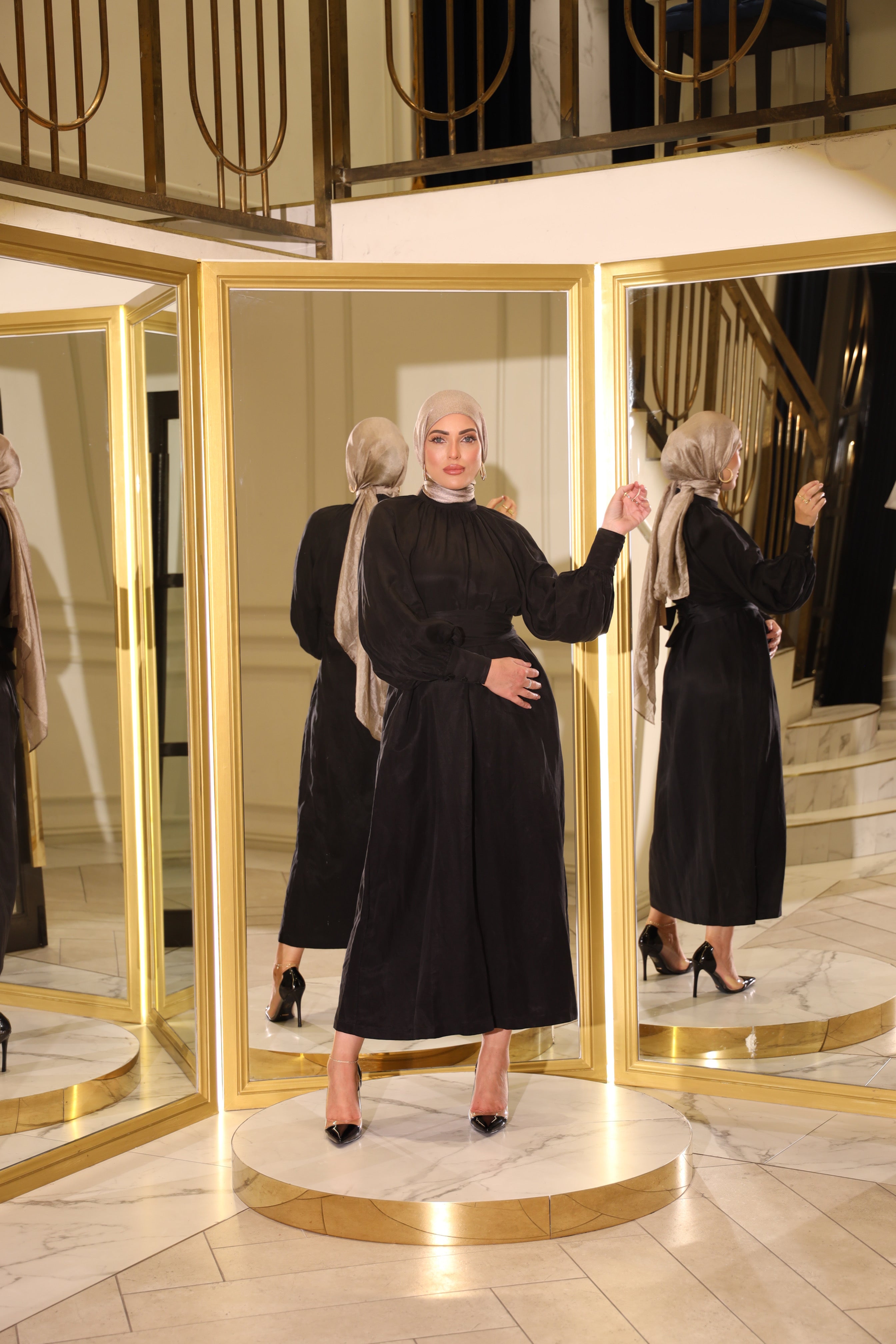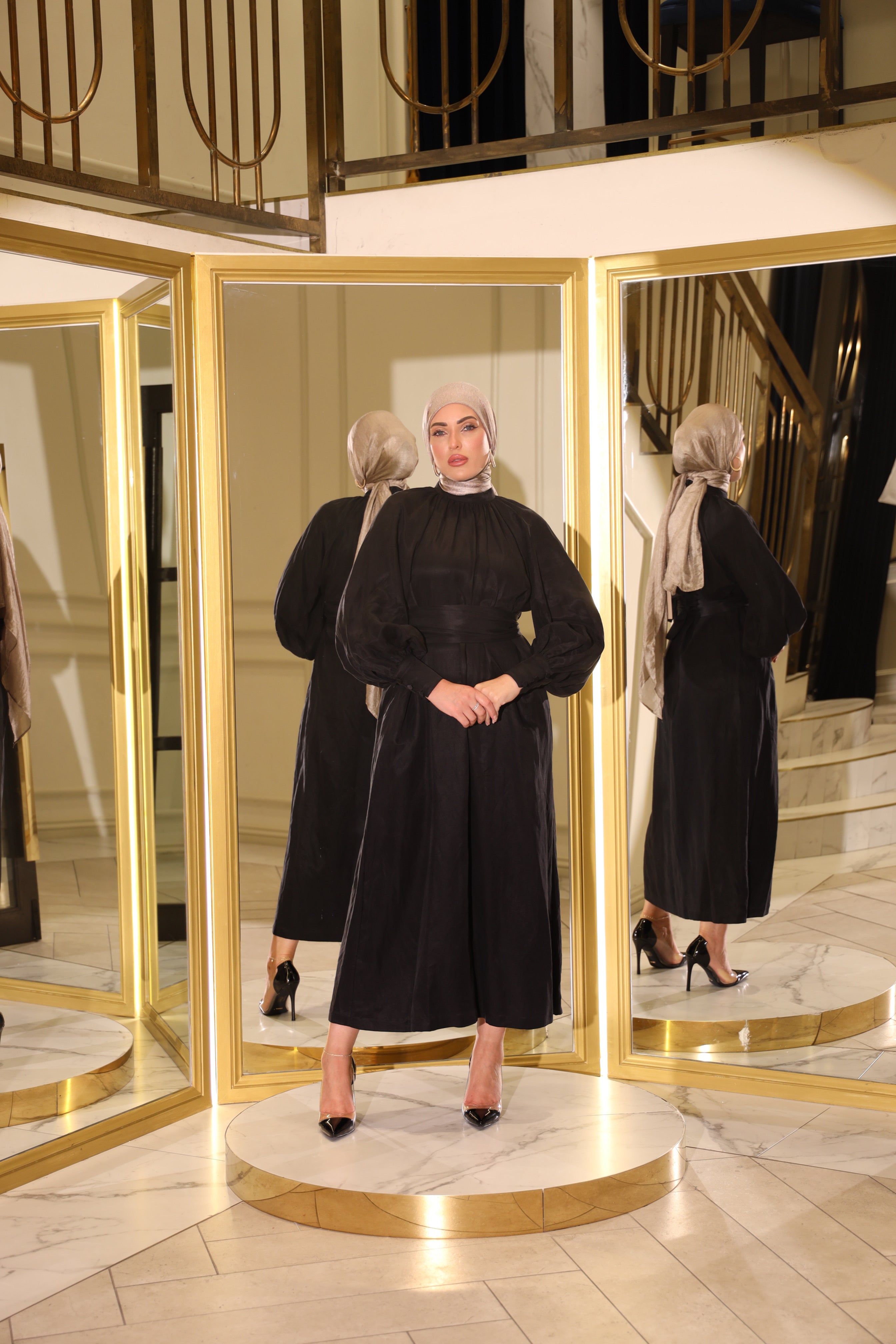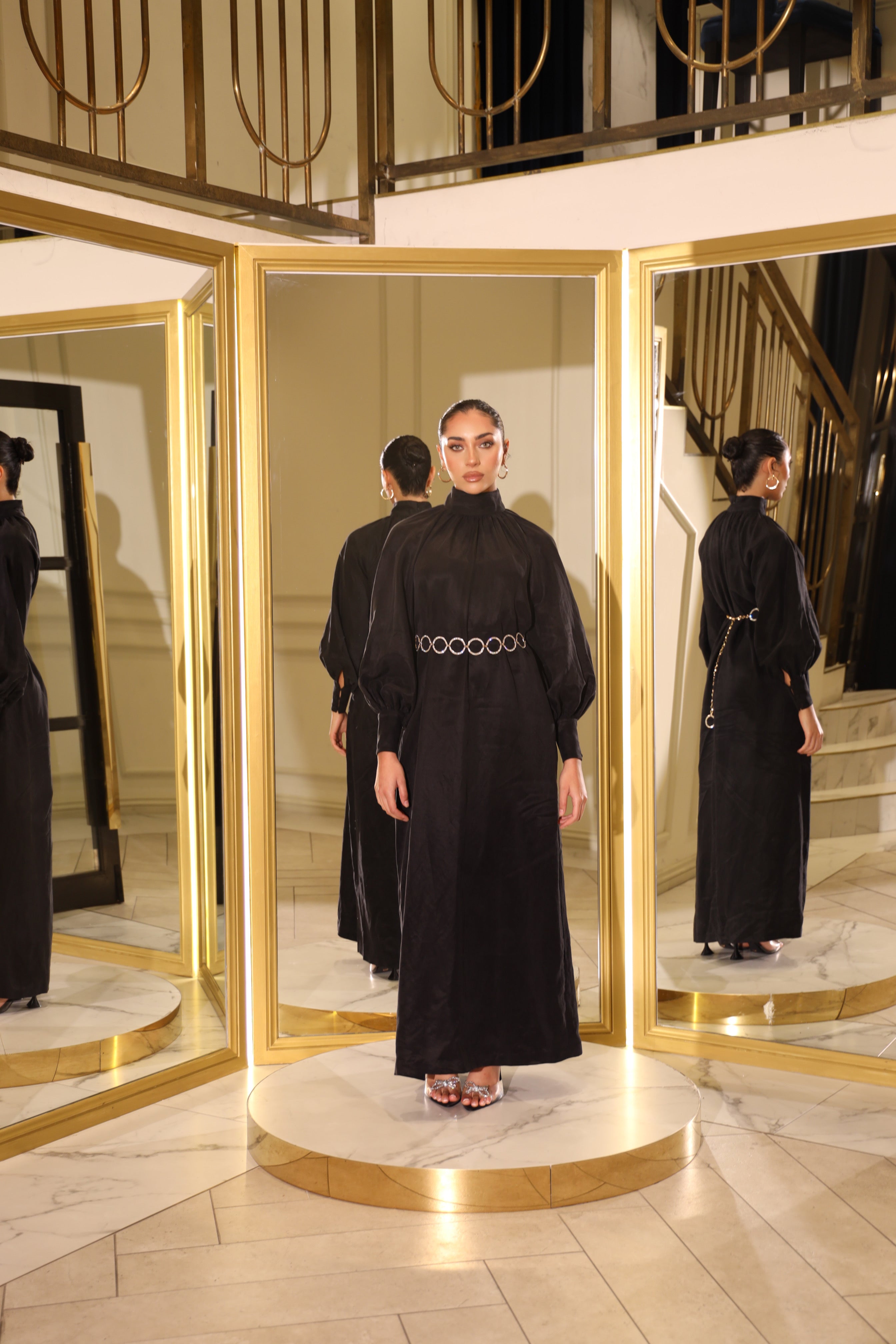 Introducing the Doha dress, made from soft, velvet linen textured fabric. This dress is made from Linen tencel, with 50% Cuprammonium. The dress features a high neck collar, with gathers at the neckline and around the shoulder area. The dress is A-line, but can be sinched in with a removable belt, giving you the option to wear it with or without. Doha also contains pockets, and a 60cm invisible zipper. The dress is also unique for its Balloon sleeves, containing 3 buttons with loops at the cuff.