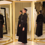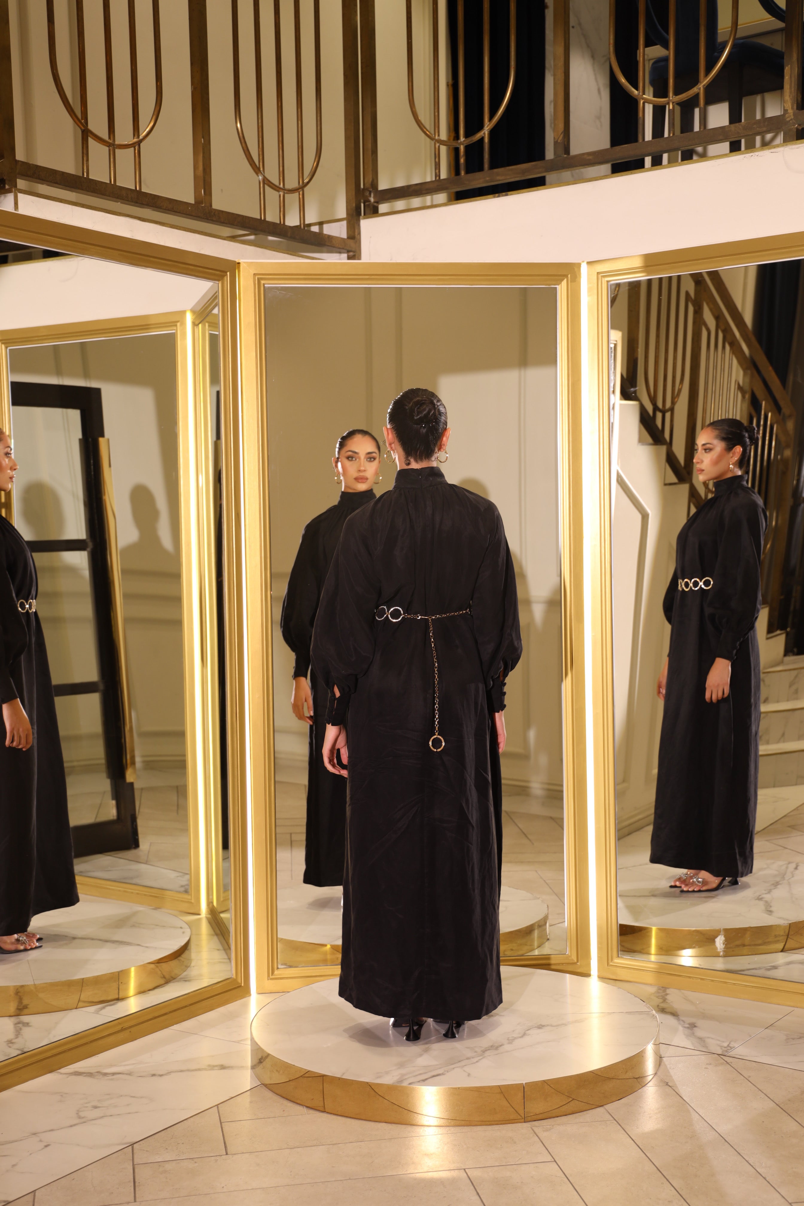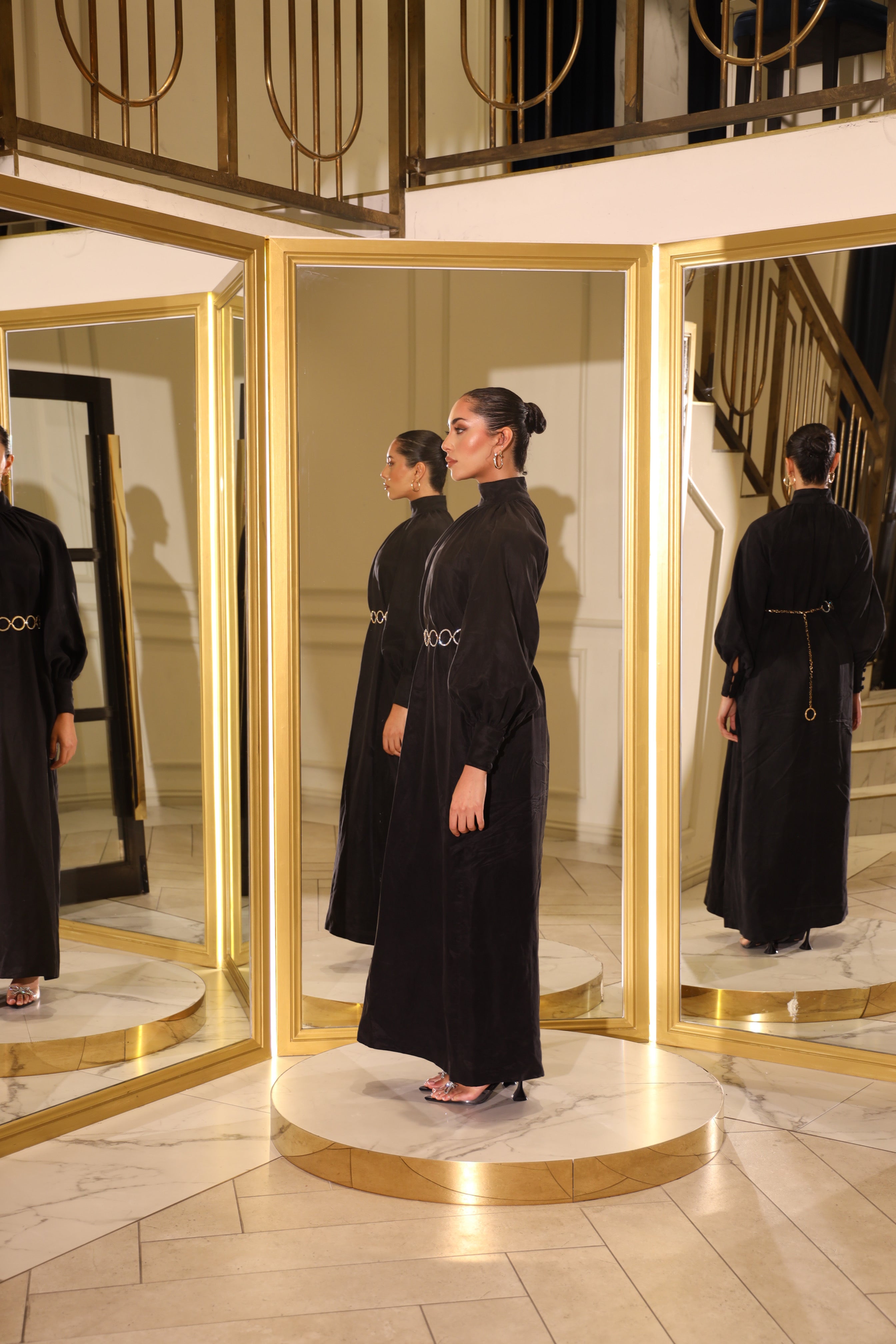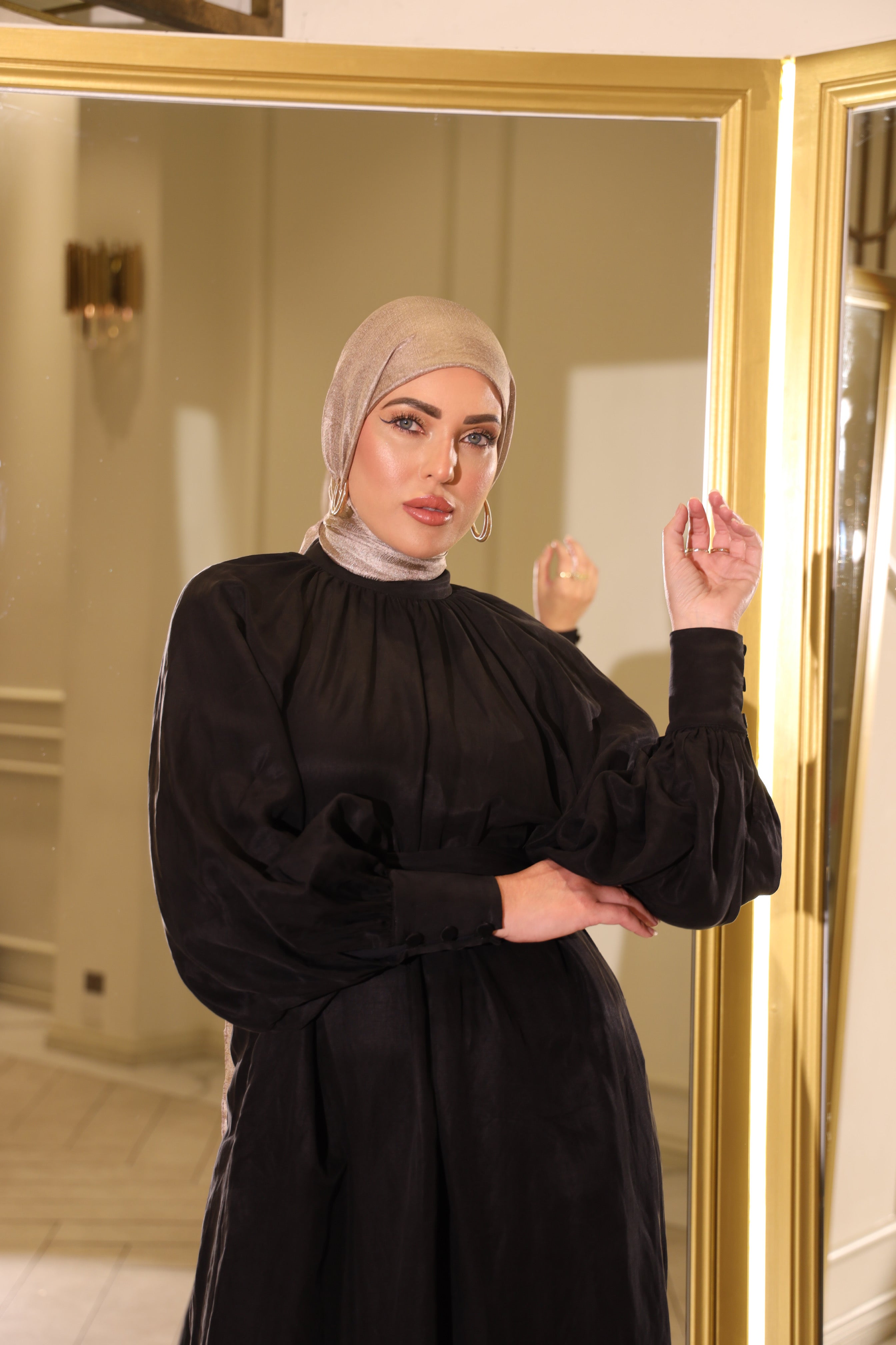 Introducing the Doha dress, made from soft, velvet linen textured fabric. This dress is made from Linen tencel, with 50% Cuprammonium. The dress features a high neck collar, with gathers at the neckline and around the shoulder area. The dress is A-line, but can be sinched in with a removable belt, giving you the option to wear it with or without. Doha also contains pockets, and a 60cm invisible zipper. The dress is also unique for its Balloon sleeves, containing 3 buttons with loops at the cuff.