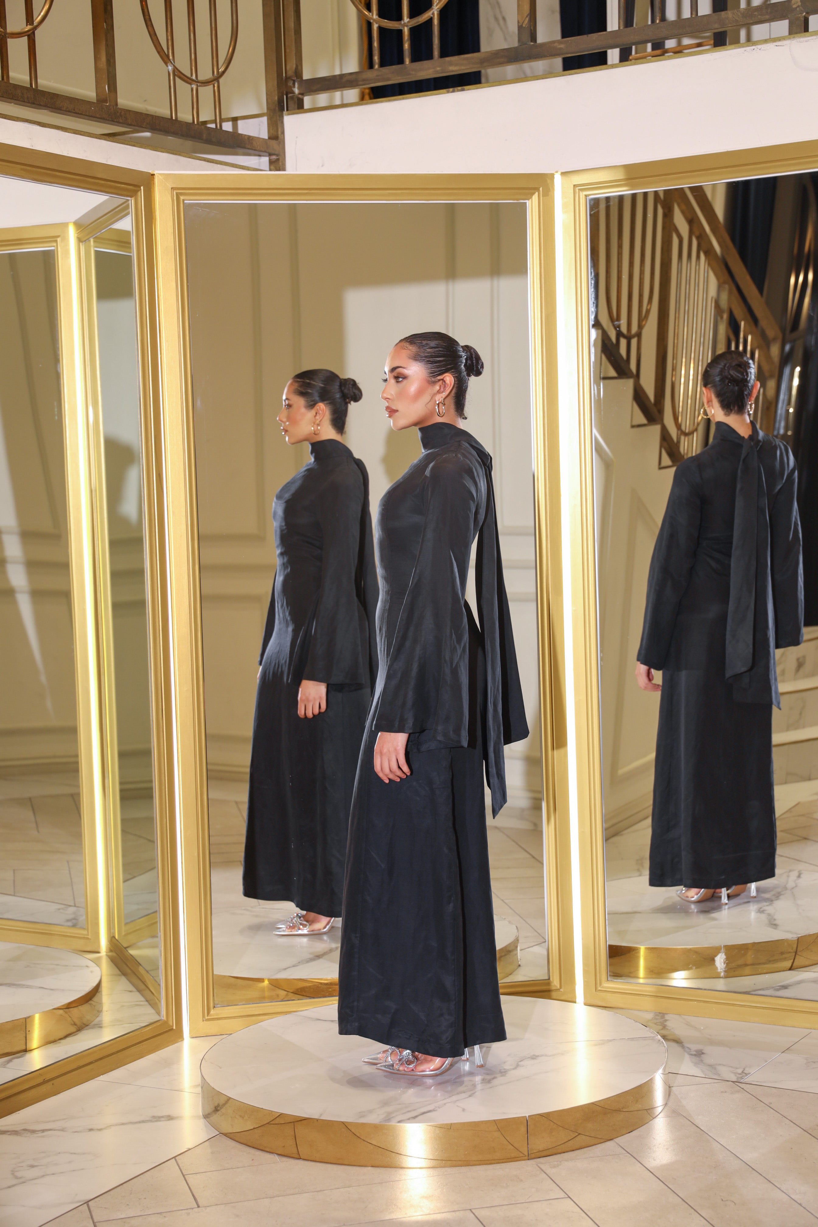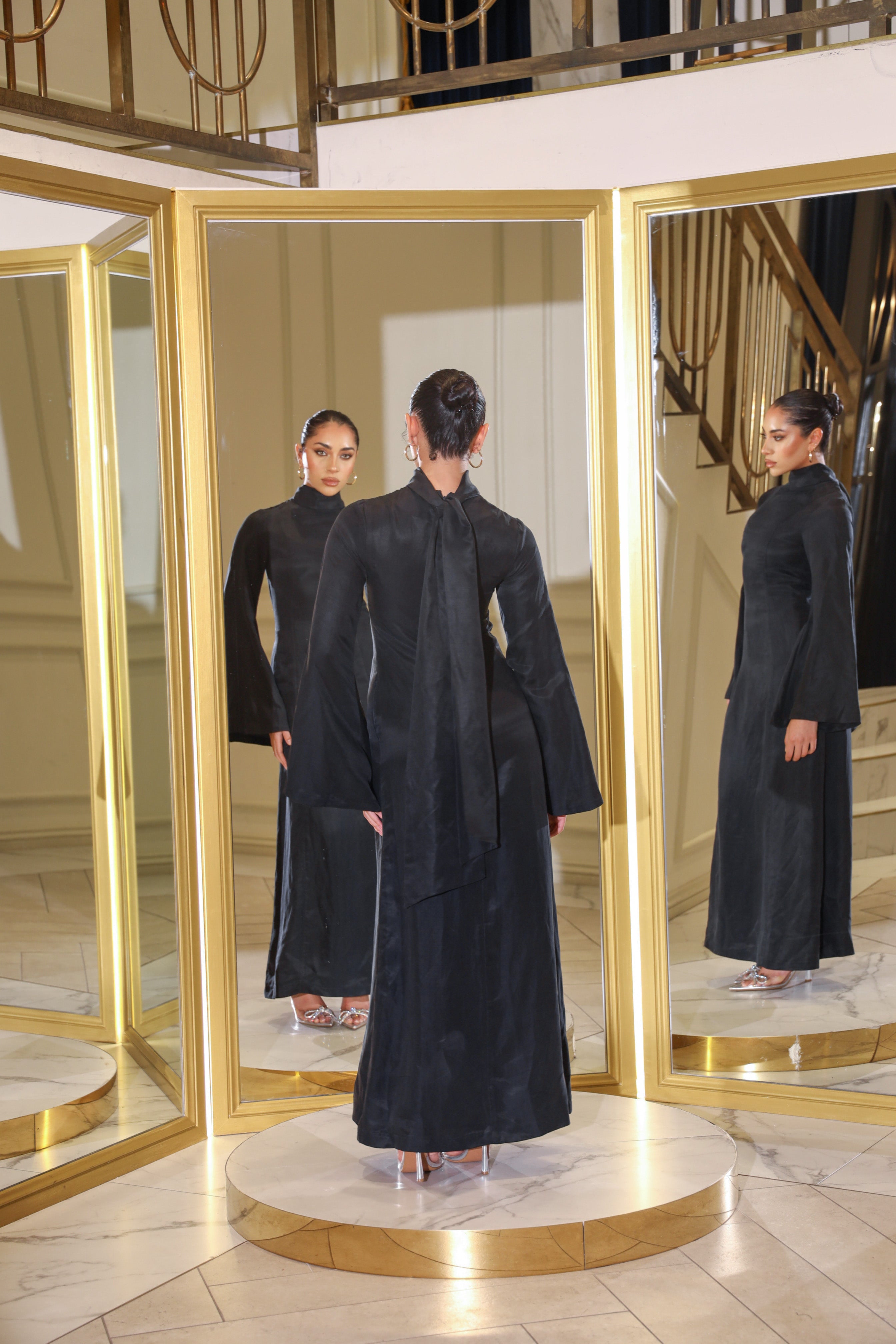 Dubai dress is an A-line fit, which features bell sleeves and pockets. The dress also has a tie, which could be tied to the front or back. The Dubai dress in 'White' is fully lined. The fabric of the dress is one that reflects in the light, executing luxury, expensive and timelessness.