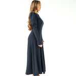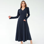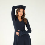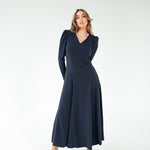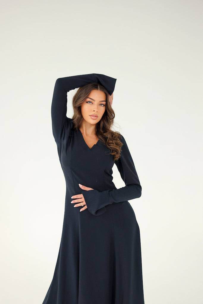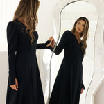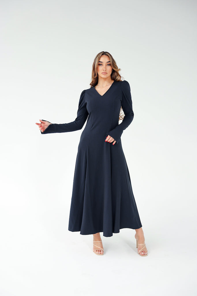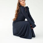 Made from premium Crepe, The Florence dress is a light weight A-line dress with self top-stitching, and a boning structure located under the bust for a slimming fit. The dress is V-neck and also contains a gathered sleeve head at the shoulder, and a slightly accentuated opened cuff, finishing before the fingers. The Florence dress is available in Black and Navy.