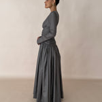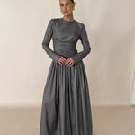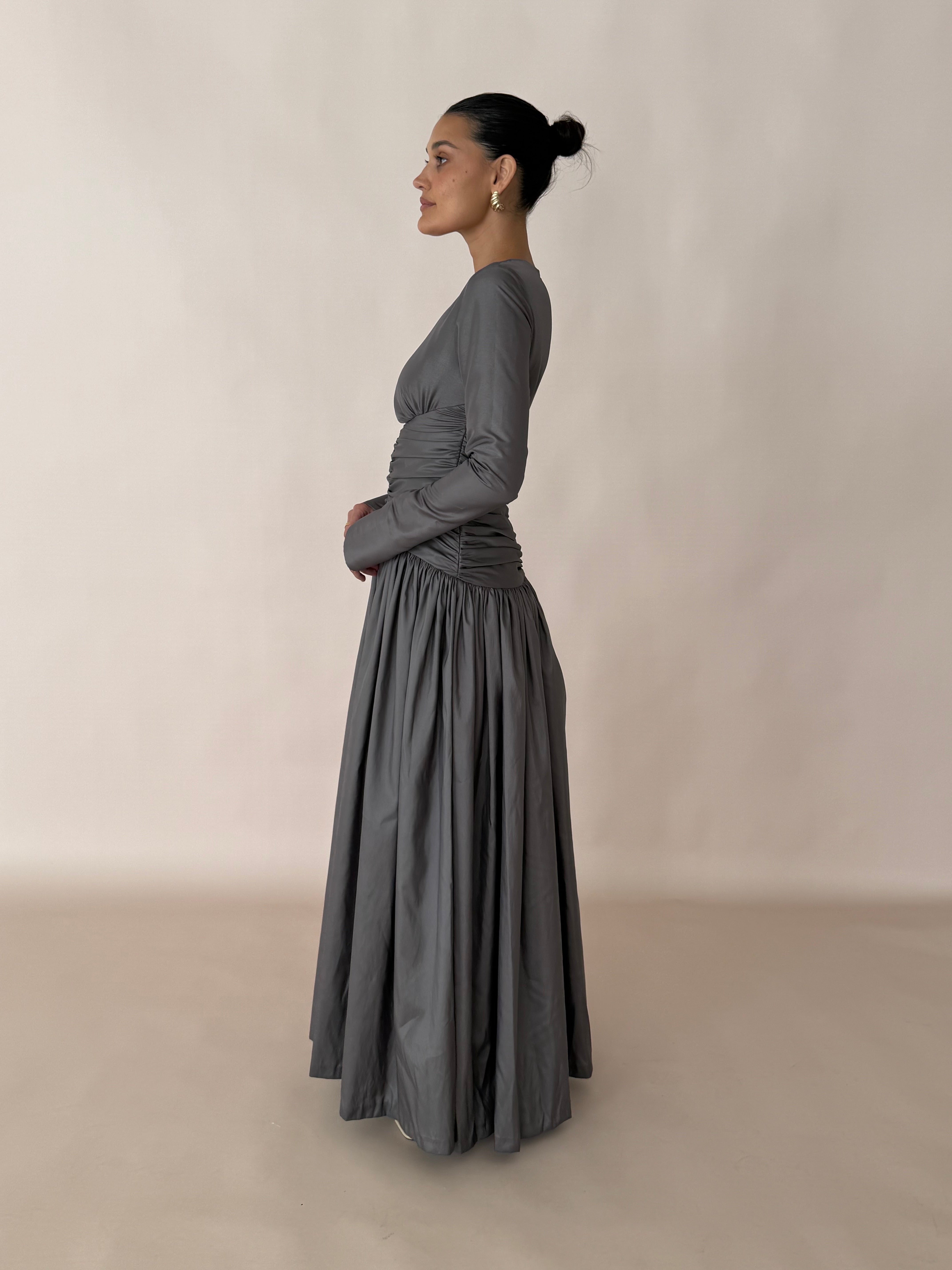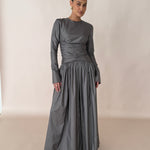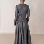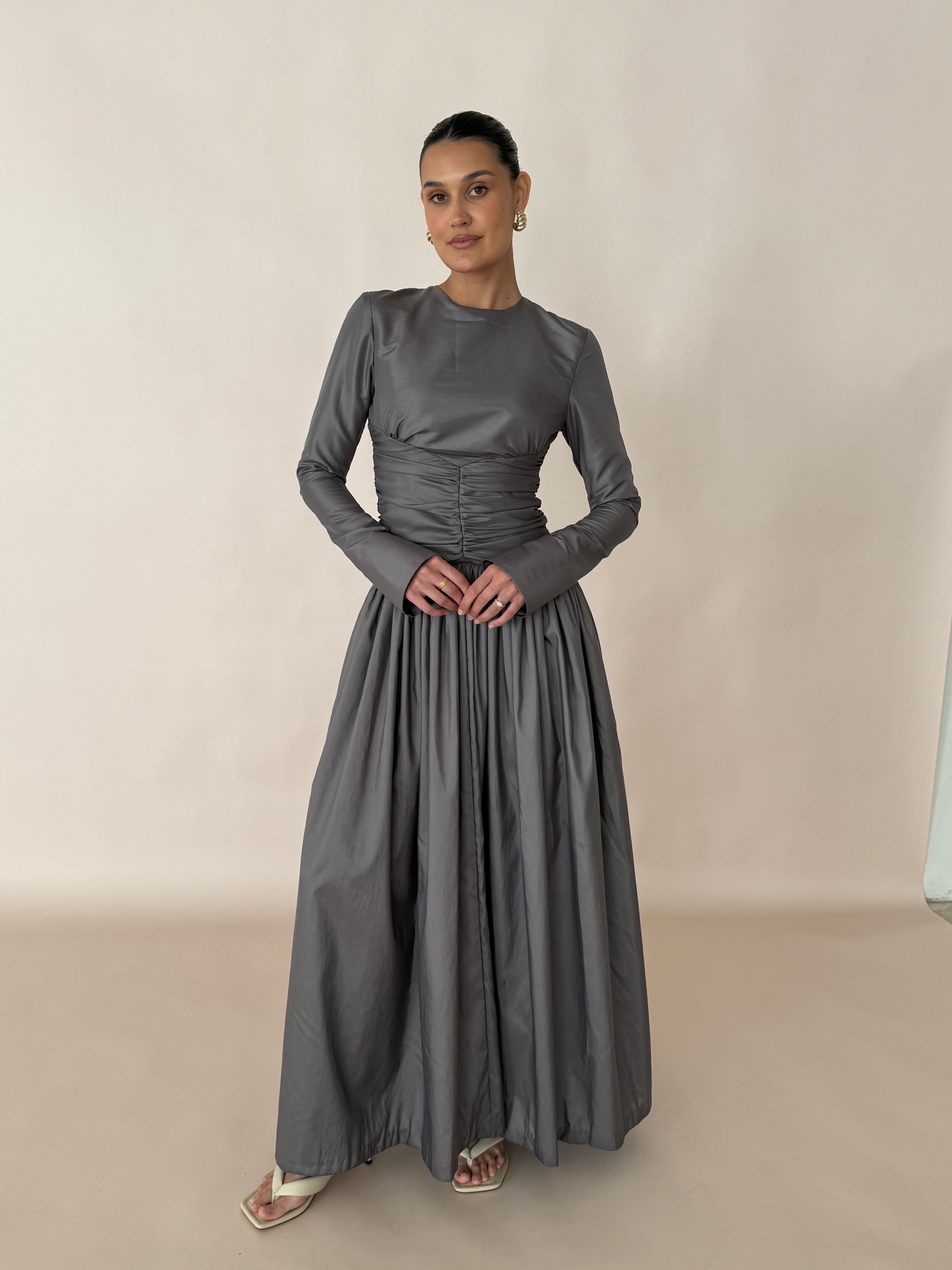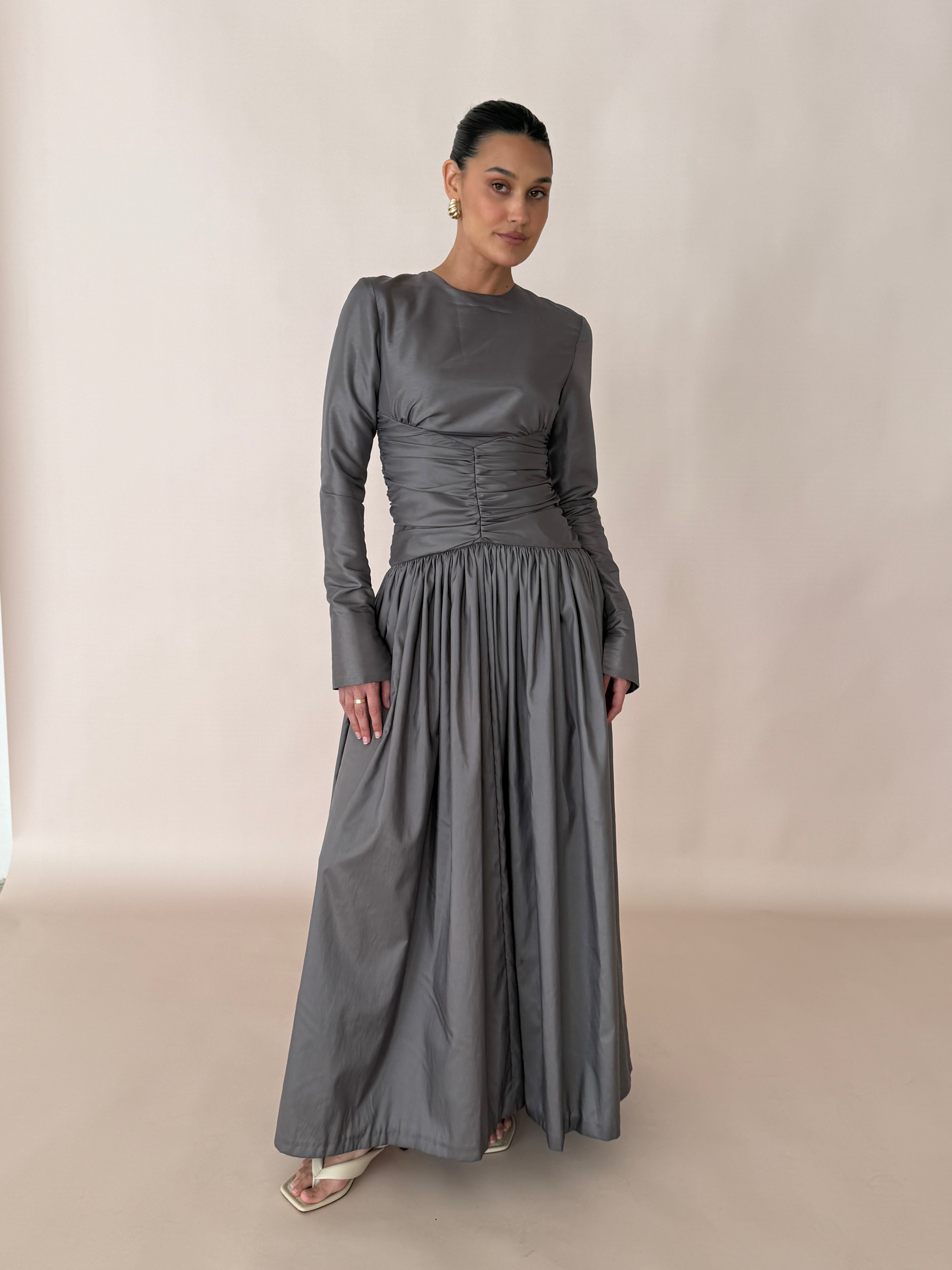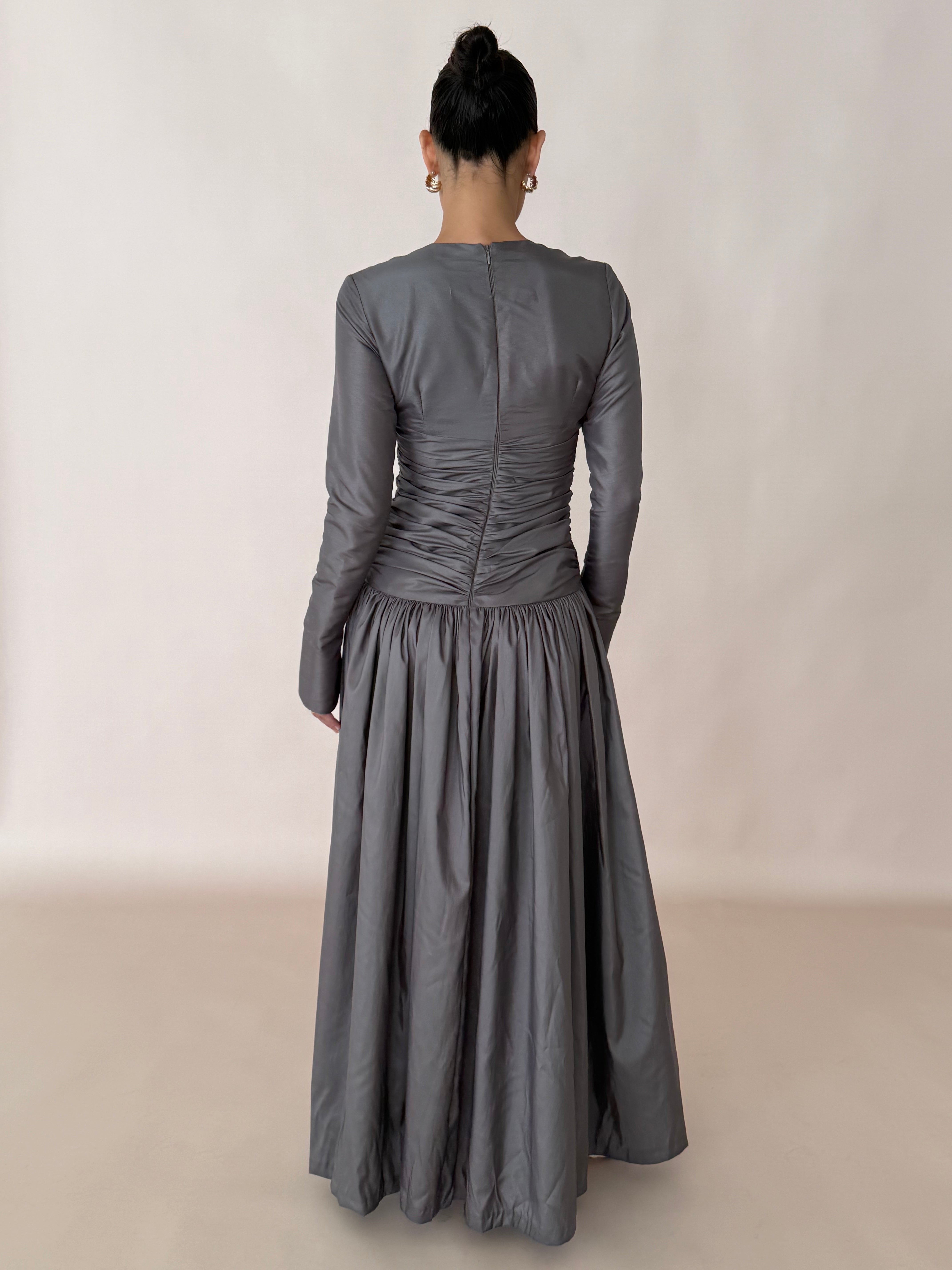 Introducing Paloma: the ultimate evening wear gown. Graceful and refined, this full-length gown is crafted from a Olive/grey metallic silk taffeta, draping effortlessly. The dress features a flattering ruched bodice that cinches at the waist, creating an elegant silhouette. Long fitted sleeves add a touch of sophistication, as well as a heavily gathered voluminous skirt flowing beautifully with every step.