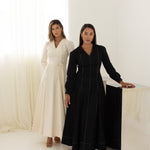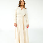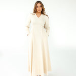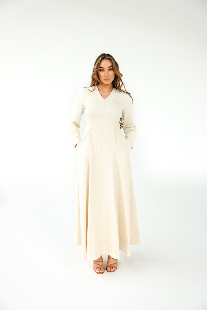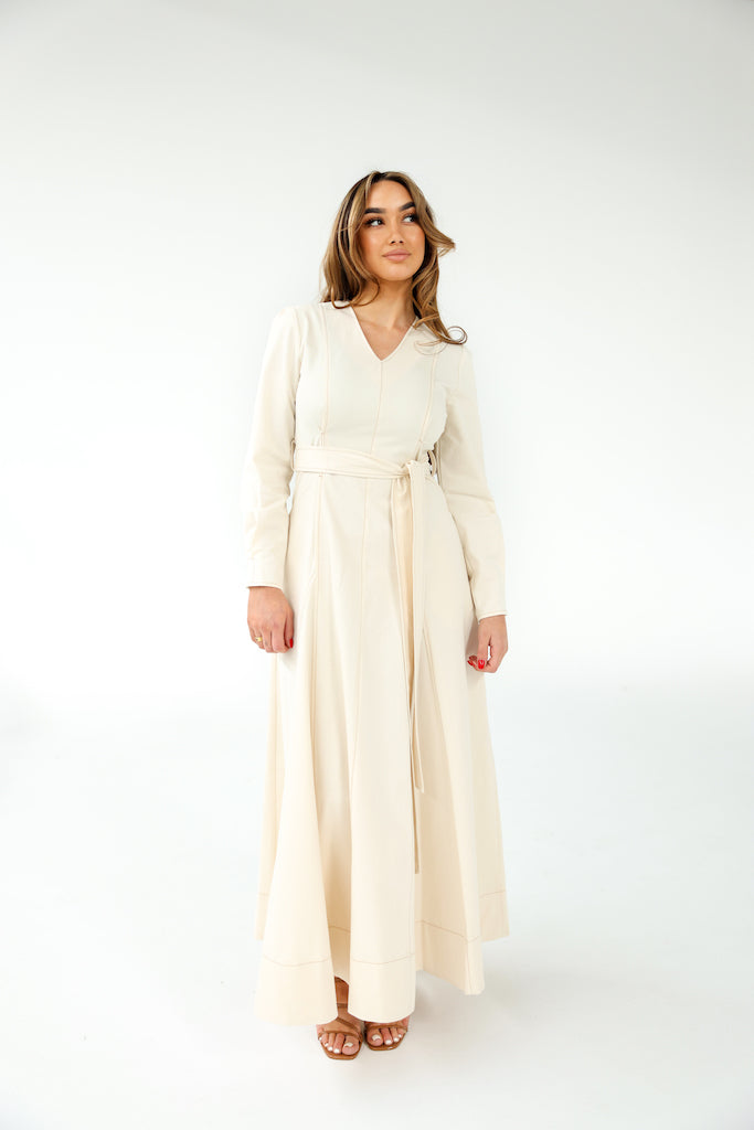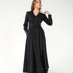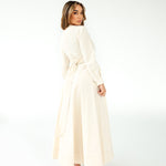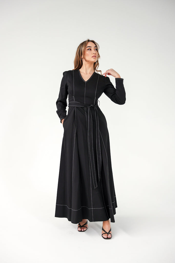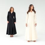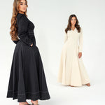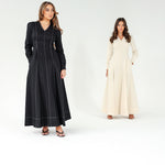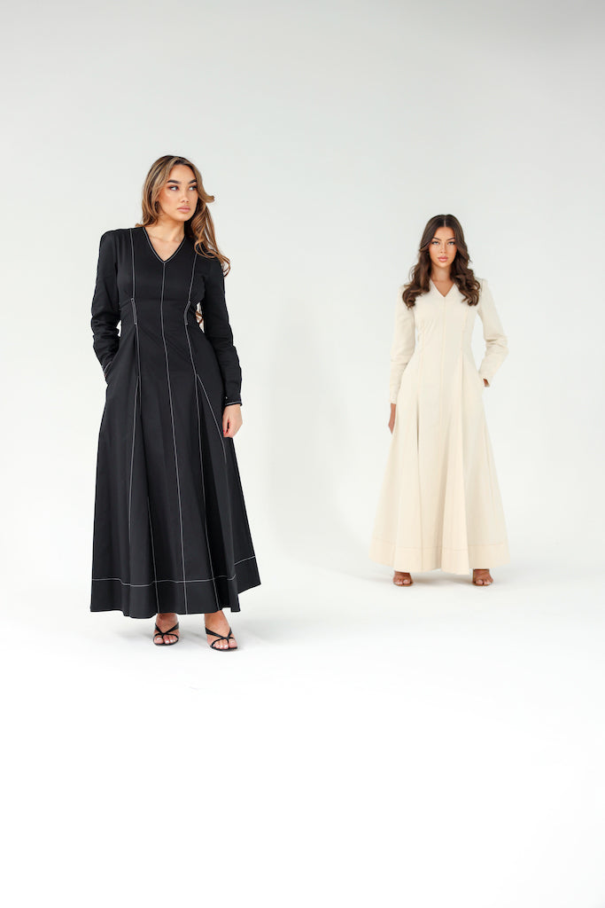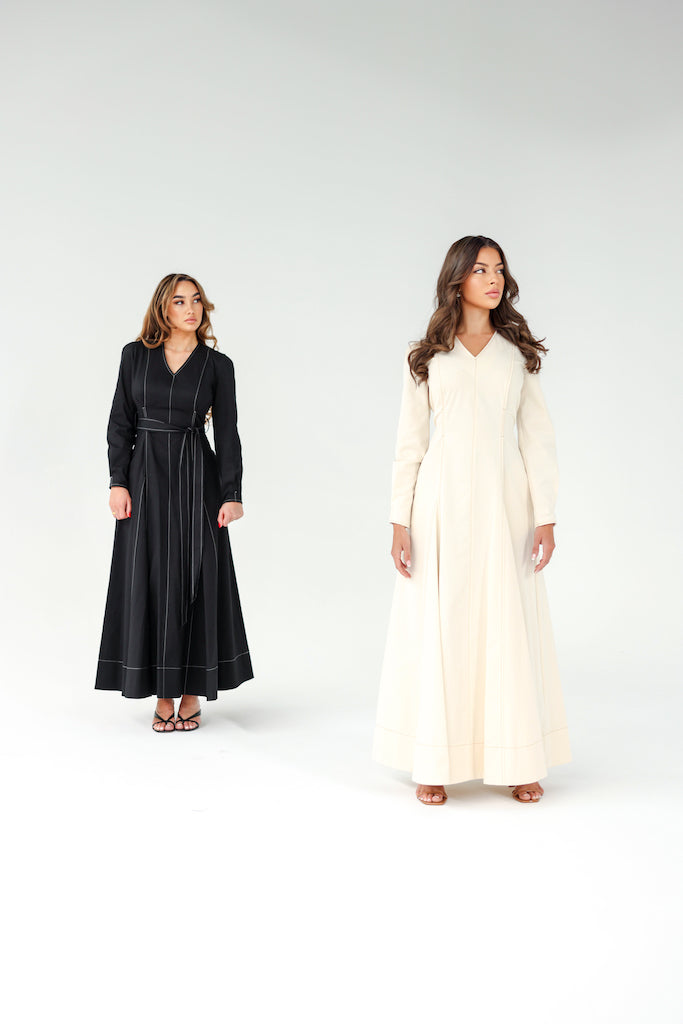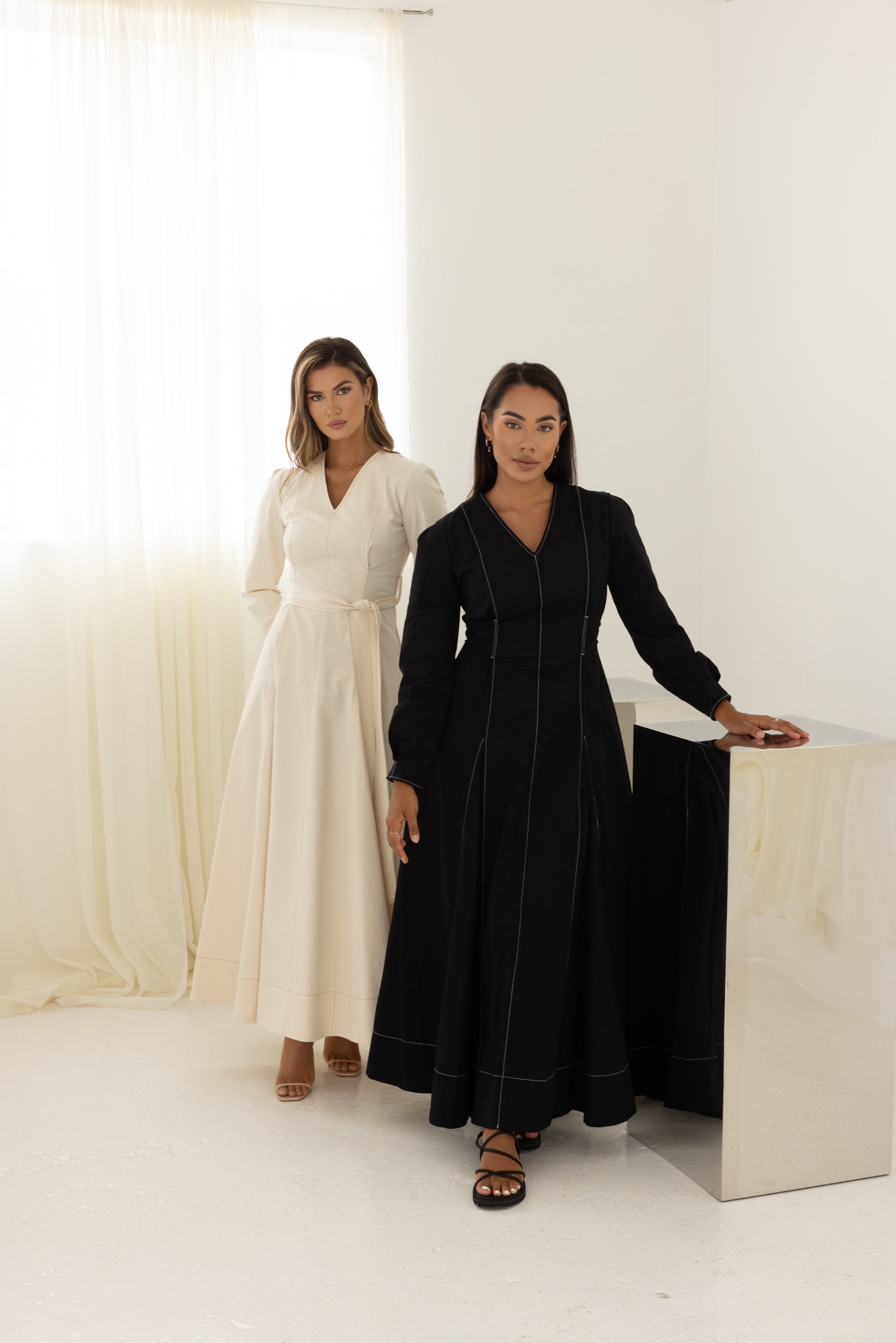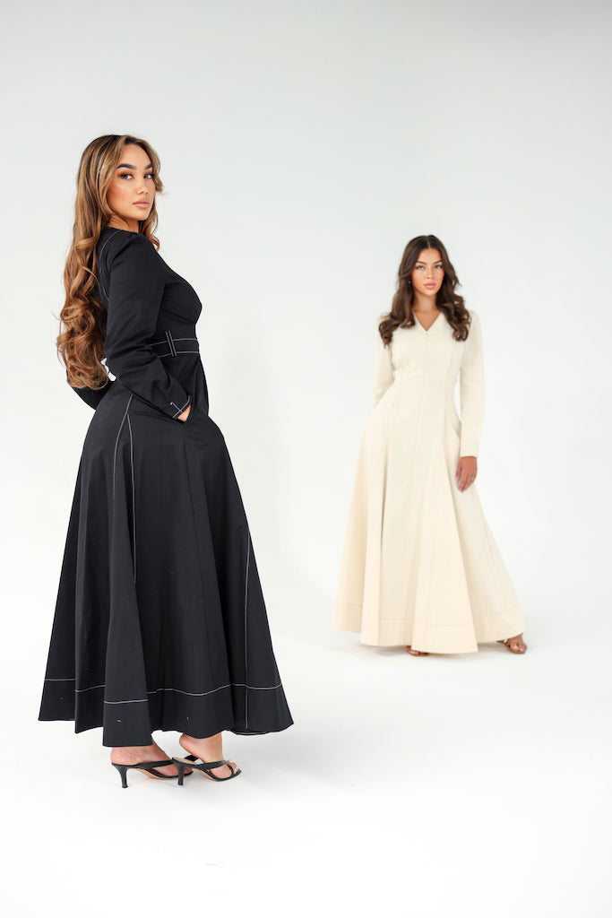 The Vienna dress is one that is very versatile. It is distinguished for its light-weight, non-opaque cotton, with no layering needed. The dress is visible for its contrasting top stitching along the panels, and godet skirt, finishing at the ankles. The dress is designed with two main features to allow for different styles of wear. It contains a belt that can be tied at the front or back, and an imitated boning feature, under the bust to cinch in your waist and slimming the body. The Vienna also includes tucks at the edge of the sleeve hem. This dress is available in two colours- black and cream.